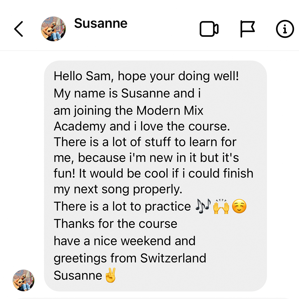 Receive Personalized Video Feedback!: Get personalized video feedback from a professional mix engineer and producer! Send me a song you are currently working on, or one that you are working on after going through the Modern Mix Academy, and I will provide you a personalized video giving you detailed feedback on how you can improve the mix or production of the song!